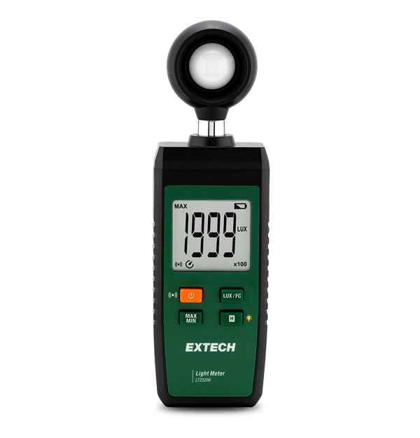 The Extech LT250W is a smart Bluetooth-enabled light meter that measures illuminance up to 100,000 Lux and wirelessly transmits data to iOS® or Android™ devices via the free ExView® app. It supports real-time monitoring, PDF reporting with photos, CSV export, and programmable Hi/Lo alarms—ideal for building diagnostics, safety audits, and lighting optimization.