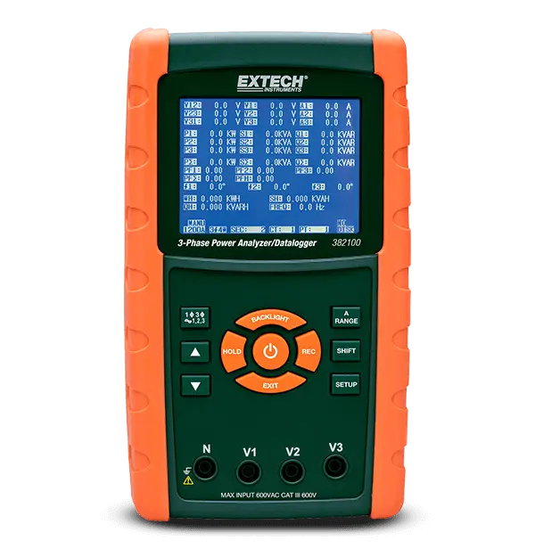 The Extech 382100 is a 3-Phase Power Analyzer/Datalogger that saves data (up to 30,000 sets of measurements) on an SD card in Excel format for easy transfer to your PC. It provides a full system analysis with up to 35 parameters including: V (phase-to-phase), V (phase-to-ground), A (phase-to-ground), KW / KVA / KVAR / PF (phase), KW / KVA / KVAR / PF (system), KWH / KVAH / KVARH / PFH (system), and Phase Angle. Readings are displayed on a large, dot matrix, sun-readable, backlit LCD. It comes with three current clamps, four voltage leads with alligator clips, eight AA batteries, SD memory card, Universal AC adapter (100 to 240 V), case, and user manual.